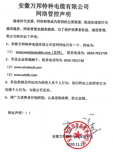 鄭重聲明:安徽萬邦特種電纜有限公司官方網站為:www_wanbangcable_com.cxjintai.com,除此之外無任何子網站或合作網站,其余均為假冒偽劣。電話:0550-7621728 13485756353 地 址:安徽省天長市滁州高新技術產業開發區經四路29號